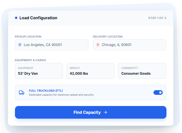 Enter your shipment details including origin, destination, and equipment requirements. Our system instantly matches your load with the right capacity.