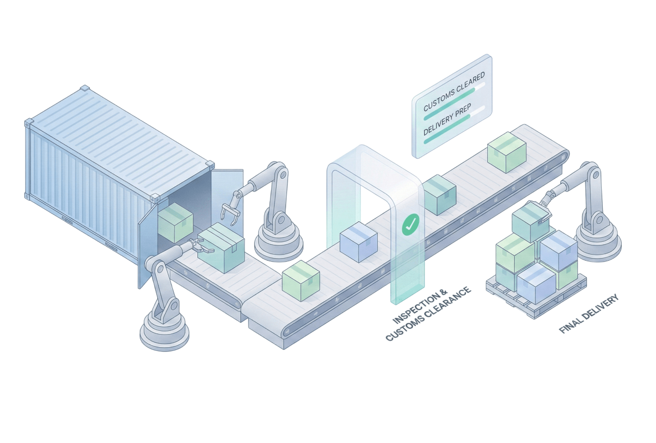 On arrival, the container is unloaded, and individual shipments are separated, inspected,and prepared for final delivery. Customs clearance is handled smoothly.